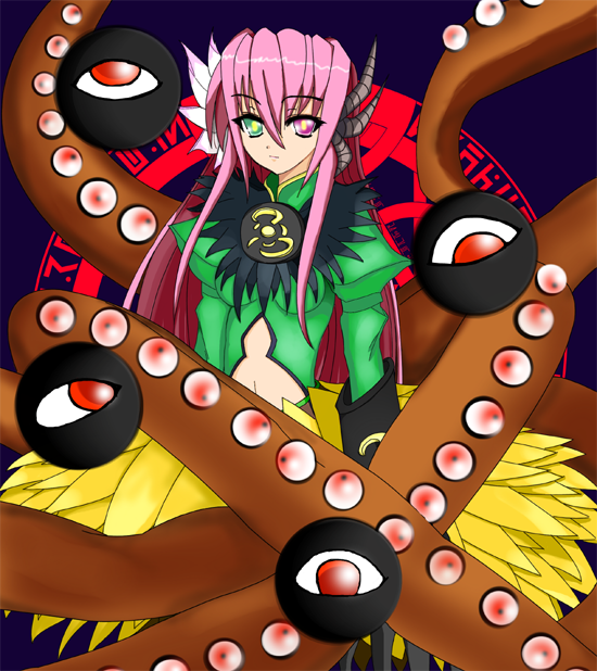 彼女は全魔力を解放する時以外に触手形態になることはほとんどなくなり、宙を浮かぶ眼も表に出すことはなくなりました。触手にある数多の眼もや宙に浮かぶ眼を使用しなくなり、顔に付いた二つの眼だけでものを見ています。